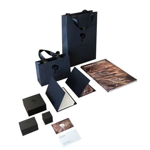 Šperky budete mít zabalené v luxusní minimalistické černé krabičce opatřené logem značky Hana Polívková. Ke krabičce je přidaná obálka s certifikátem pravosti šperků a kartičkou, jak se o šperky starat.